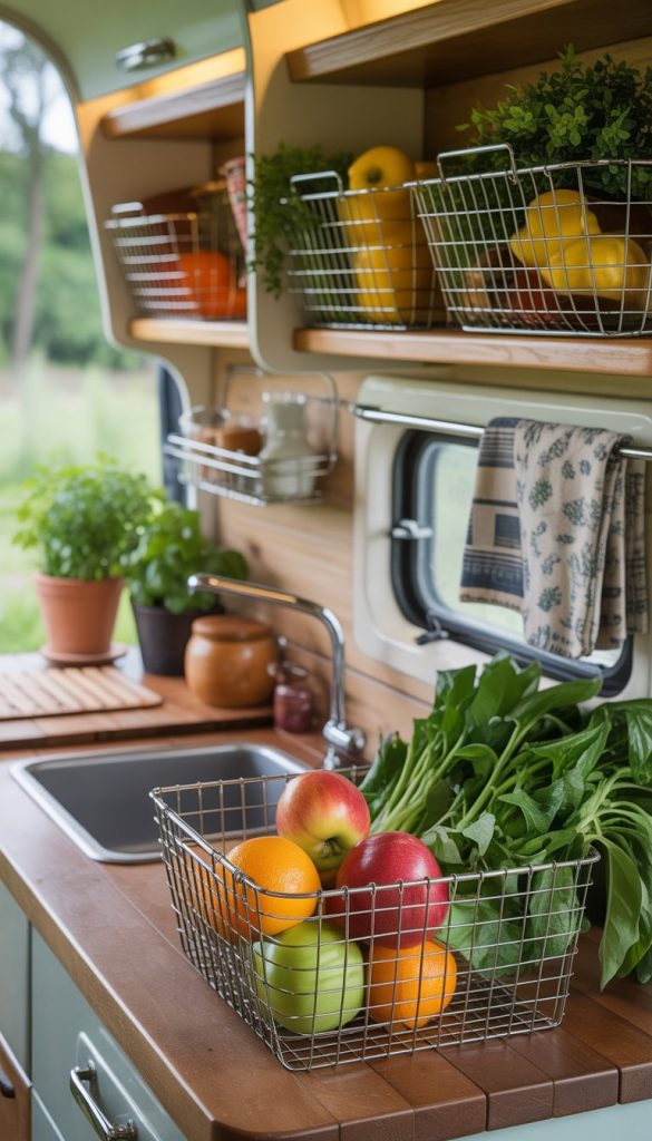 Choose baskets with different sizes to hold a variety of produce. Smaller baskets work well for garlic and onions, while bigger ones can hold apples or potatoes. This keeps your kitchenette organized and looking tidy.