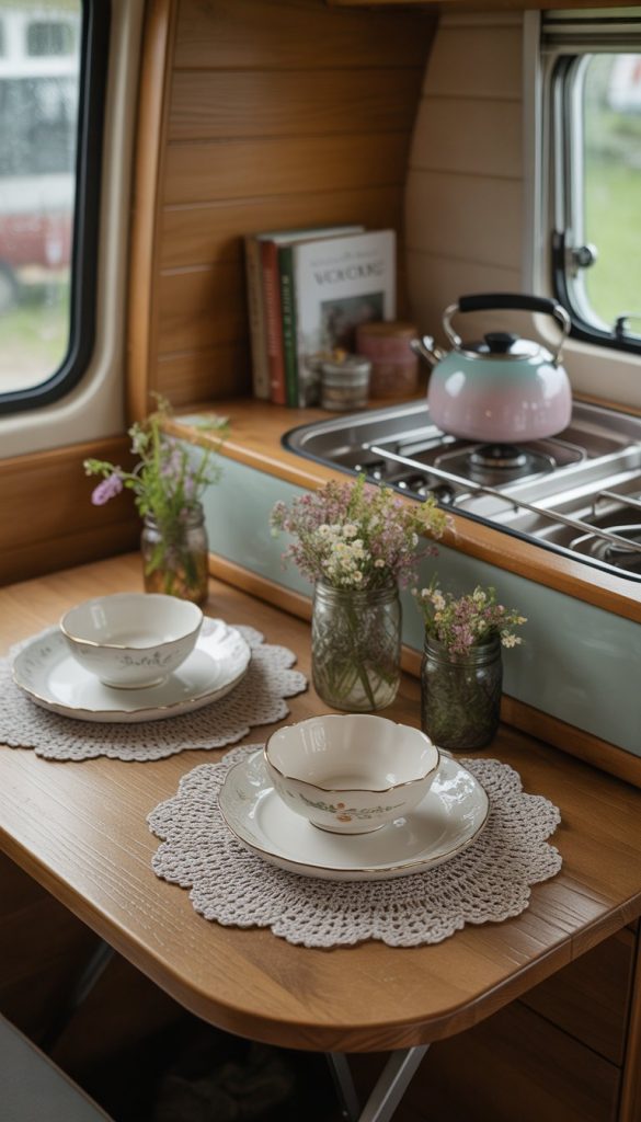 Lace doilies add a soft, vintage touch to your camper kitchenette. You can place them under dishes to protect surfaces while making your space look cozy and charming.