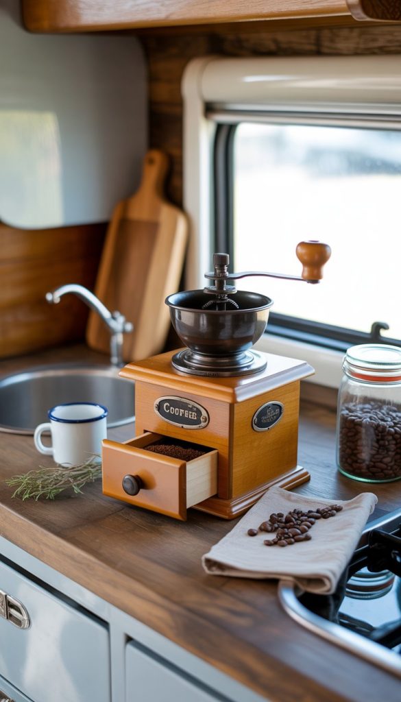 An old-fashioned coffee grinder adds charm to your shabby chic camper kitchenette. It brings a vintage feel that fits perfectly with the rustic, cozy style. You can place it on a shelf or countertop where it’s easy to see.