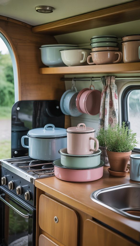 Using vintage enamelware is a great way to add charm to your camper kitchenette. These pieces are sturdy and perfect for storing kitchen basics like utensils, snacks, or even cleaning supplies.