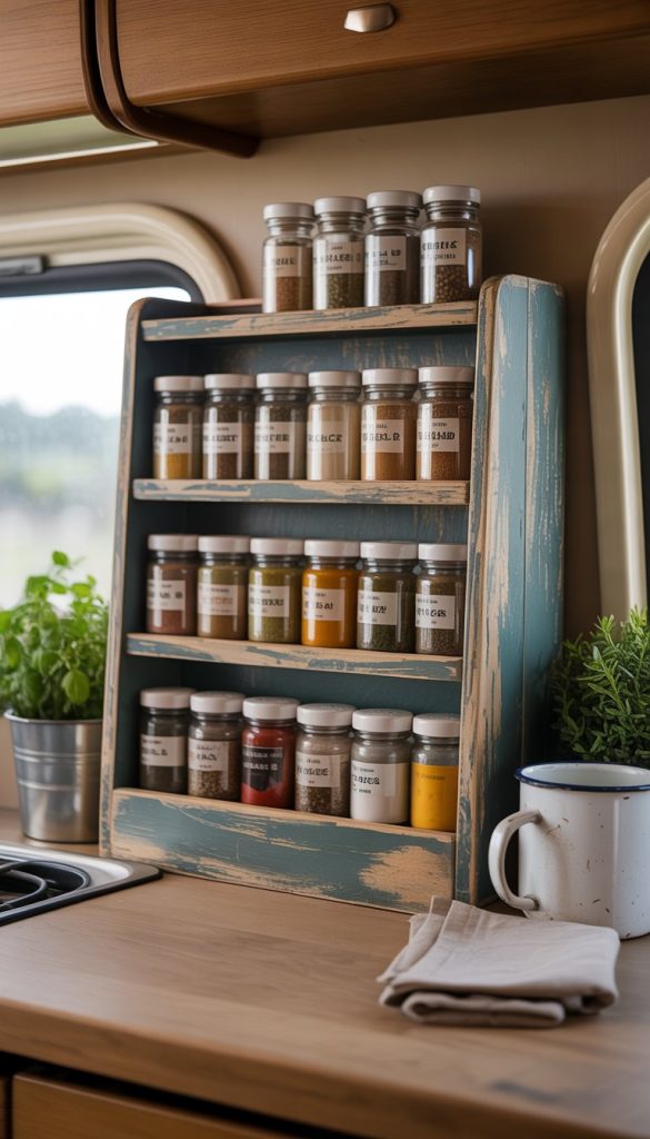 A distressed wooden spice rack adds charm to your shabby chic camper kitchenette. It gives a rustic feel that fits the style perfectly.