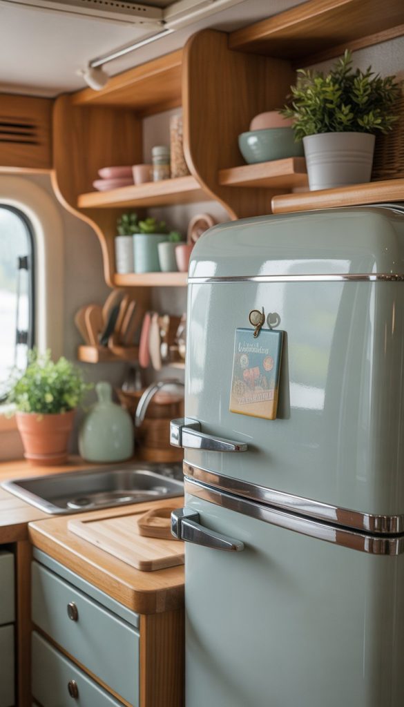 A small vintage fridge magnet can add charm without taking up space. Look for one with soft colors or a worn look to match your shabby chic style. It’s a simple way to bring character to your camper kitchenette.