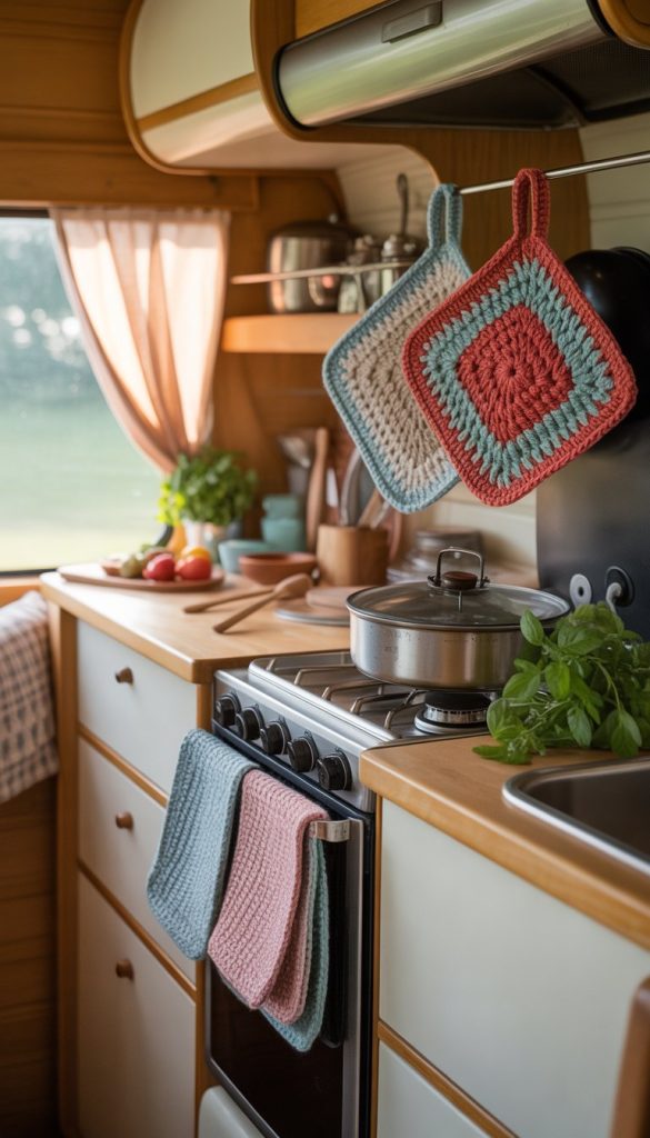 Handmade crochet potholders add a cozy and personal touch to your camper kitchenette. They fit perfectly with the shabby chic style by bringing in soft textures and vintage charm. Plus, they are practical for handling hot pots and pans.