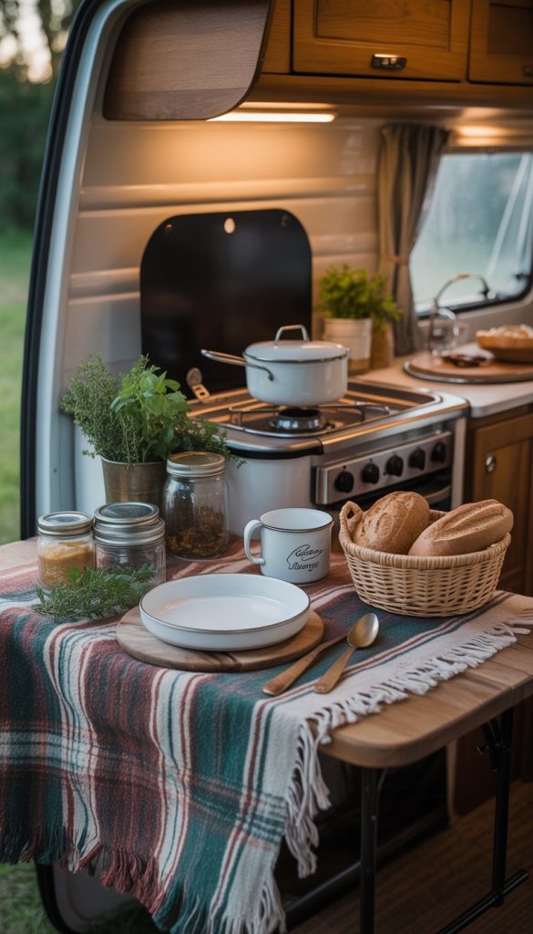 A weathered picnic blanket adds charm to your camper kitchenette. It brings a soft, cozy look that fits well with shabby chic style. You can choose a blanket with faded colors or gentle patterns to keep the vintage feel.