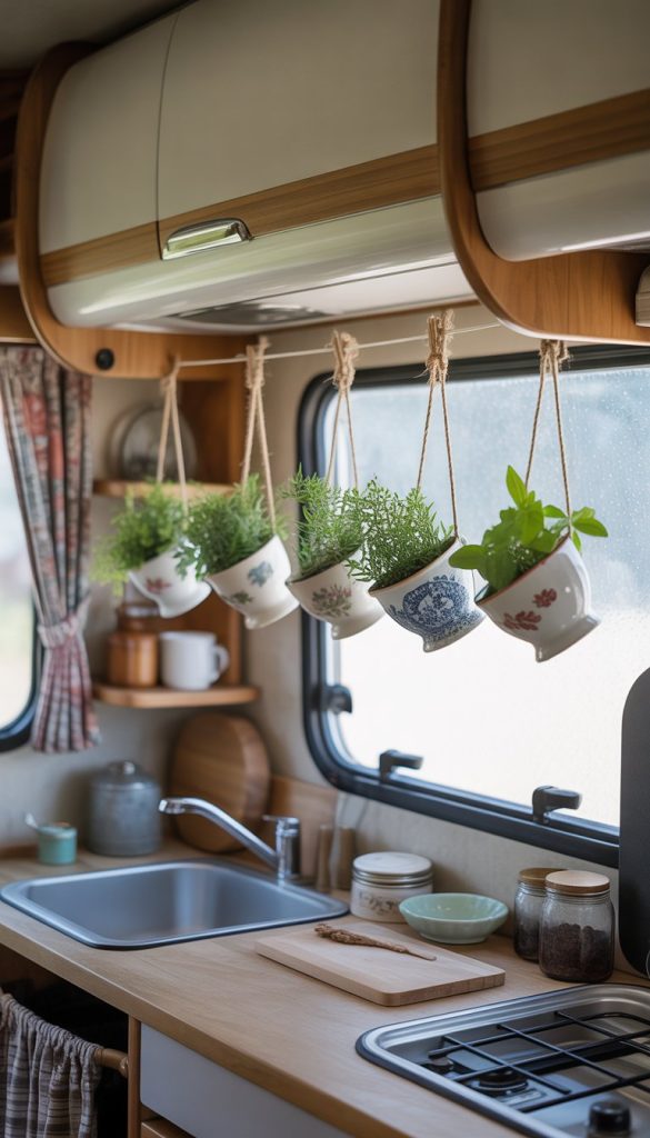 Using teacups to hang small plants adds a sweet, vintage touch to your camper kitchenette. You can find old teacups at thrift stores or use ones you already have. They make great little planters for herbs or succulents.