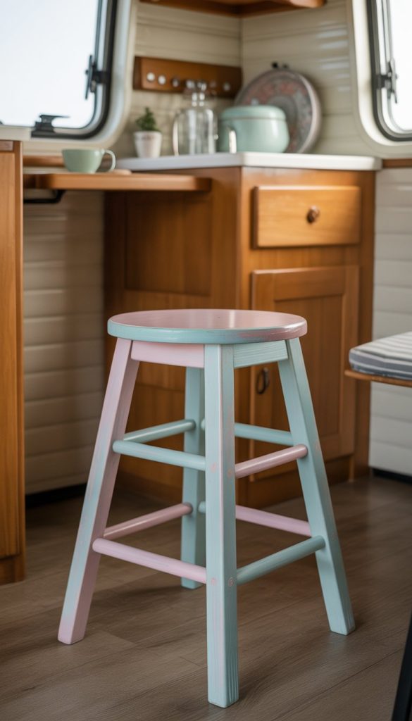 A pastel-painted wooden stool fits perfectly in a shabby chic camper kitchenette. It adds a soft pop of color without being too bright or flashy. Choose colors like light pink, baby blue, or mint green to keep the vibe gentle and cozy.