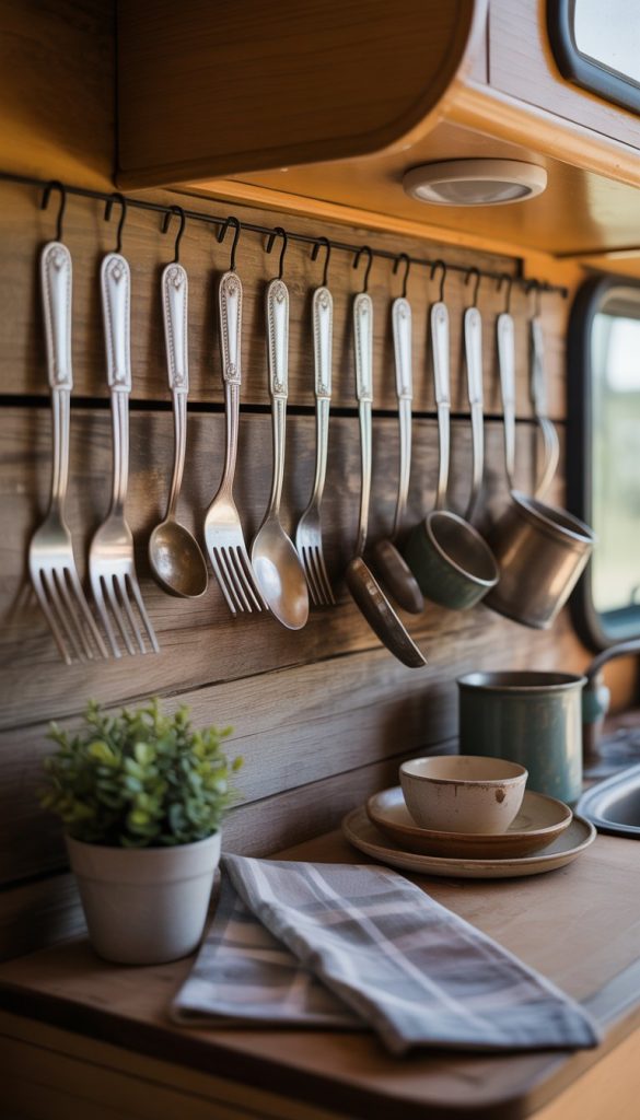 Using old silverware as hooks adds a unique, vintage charm to your camper kitchenette. You can bend spoons or forks to create sturdy hooks for hanging towels, mugs, or keys. This simple idea keeps things organized while adding a personal touch.