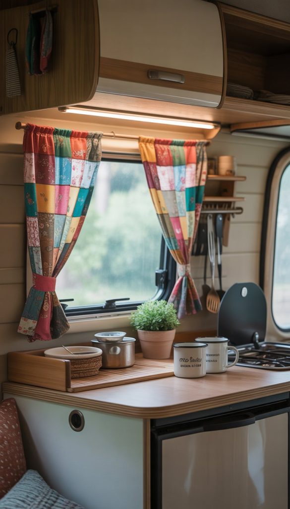 Use old clothes or leftover fabric scraps to create your patchwork. This saves money and adds a personal story to your camper kitchen. You can also sew a simple curtain or use fabric glue if sewing is not your thing.