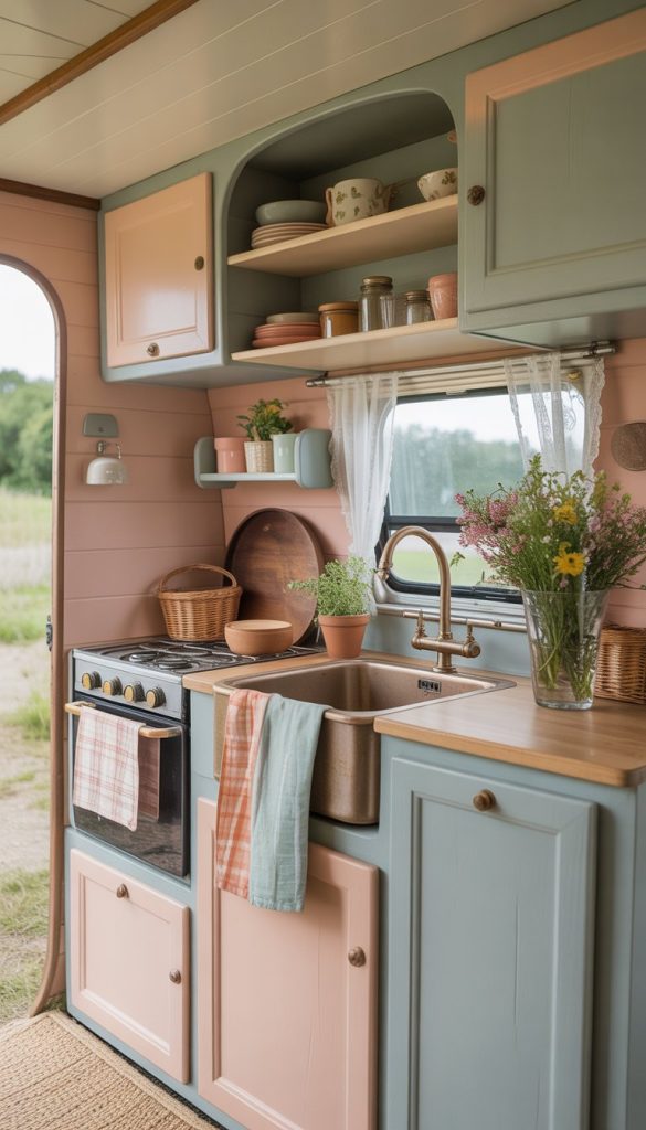 Soft pastel colors give your camper kitchenette a calm and cozy feel. You can pick light shades like mint green, baby blue, or pale pink. These colors help make the small space look bigger and brighter.
