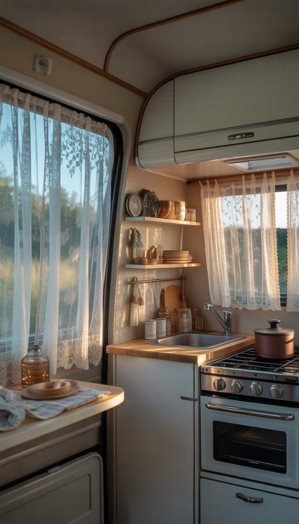 Lace curtains bring a soft, cozy touch to your camper kitchen. They let in light but still give you some privacy. The delicate look fits perfectly with shabby chic style.
