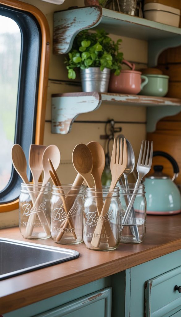 You can paint the jars with soft colors or wrap them with lace or twine. This makes them look more charming and fits the style of your camper kitchen.