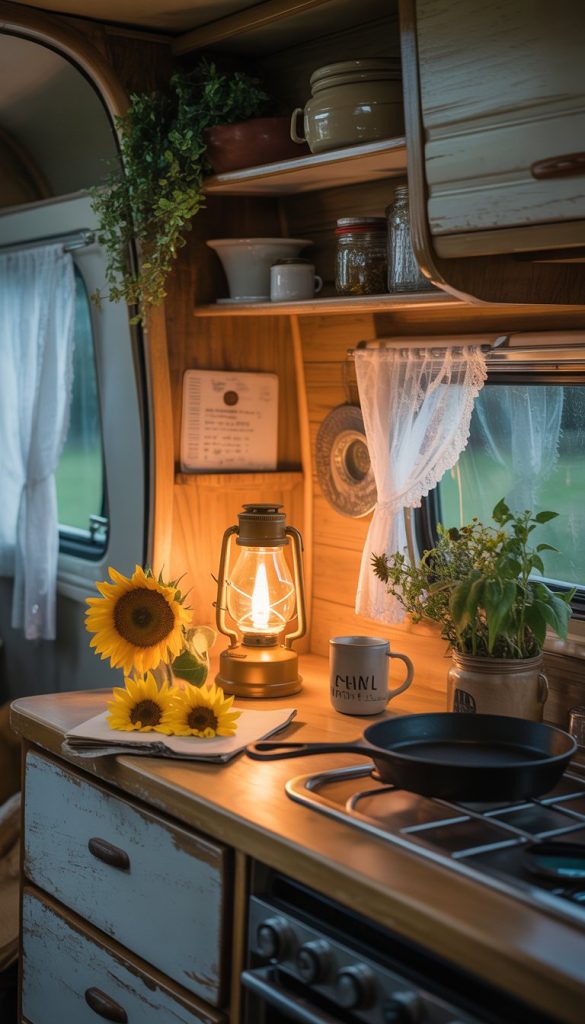 Adding a sunflower oil lamp brings soft, warm light to your camper kitchenette. It fits well with the shabby chic style by giving a cozy, vintage feel. The gentle glow makes your space feel inviting and comfortable.