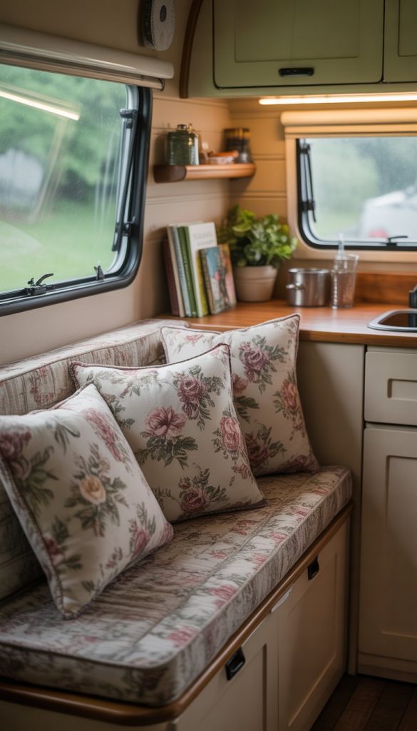 Floral patterned cushions can bring a soft, cozy feel to your camper kitchenette. They add color and charm without needing a lot of space. You can choose cushions with small flowers for a delicate look or bigger prints for more impact.