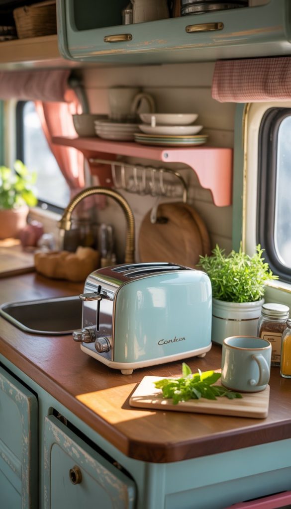 Adding a retro-style toaster brings charm to your camper kitchenette. These toasters have a simple design with bright colors that fit the shabby chic look well. They also take up little space, which is great for smaller kitchens.
