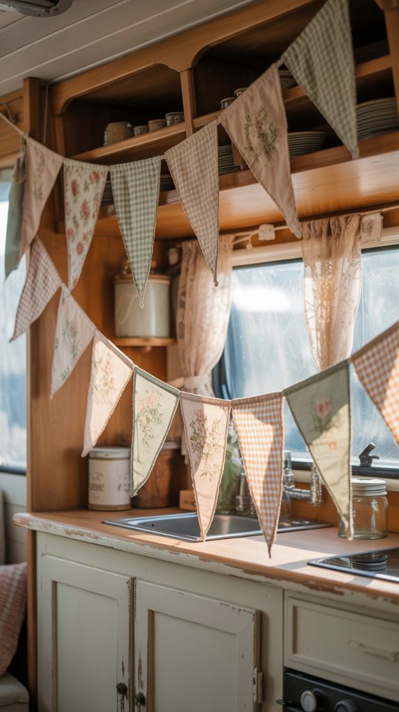 Bunting flags add a soft, charming touch to your camper kitchenette. Using faded fabrics keeps the look gentle and worn, which fits the shabby chic style well.