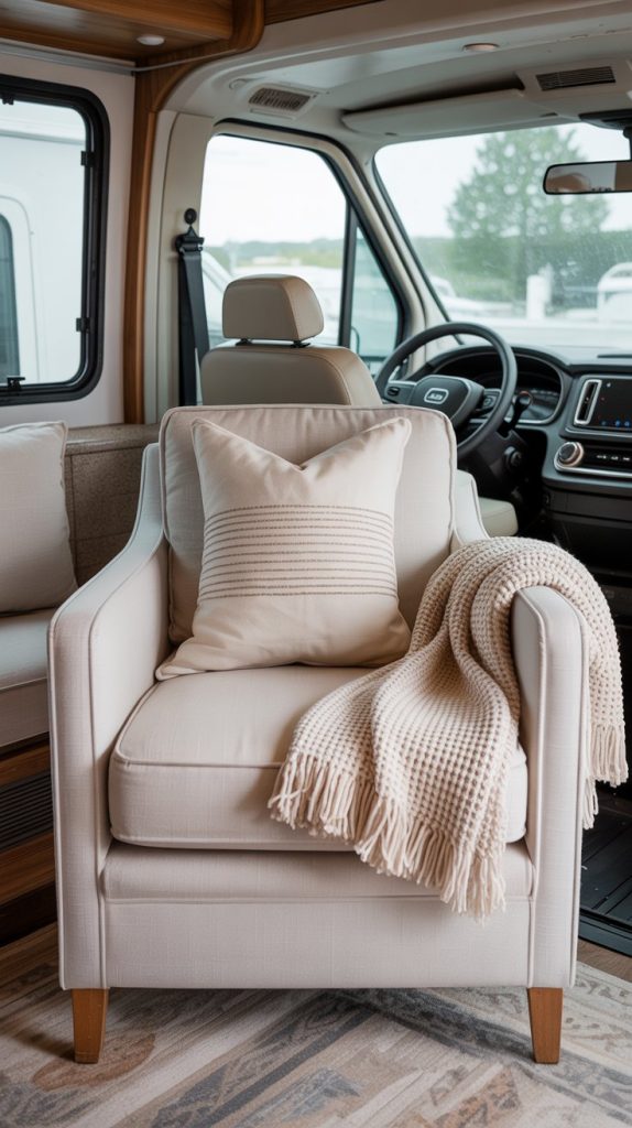 An accent chair can transform an RV living room from a standard layout into a cozy, residential-style retreat. This image features a compact, upholstered armchair in a soft cream linen fabric tucked into a corner next to the sofa. Its classic rolled arms and comfortable scale make it an inviting spot for reading or conversation. A simple, knitted throw blanket is casually draped over one arm.