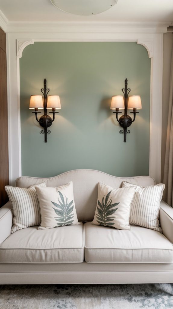 An accent wall can add incredible depth and character without closing in the space. This image showcases the main wall behind the sofa painted in a soft, moody hue like sage green, dusty blue, or even a warm greige. This contrasting color defines the living area and makes the sofa pop. The wall is adorned with a simple, black wrought iron sconce on each side, providing perfect reading light without taking up table space.