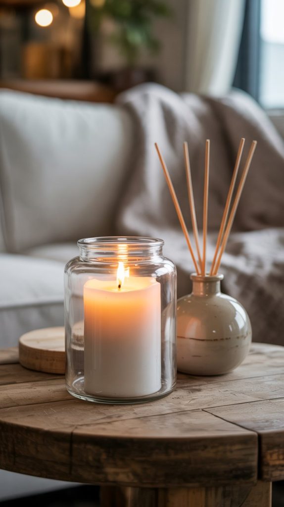 Serenity is a multi-sensory experience, and the living room is the perfect place to establish it. This image is a styled shot of the coffee table, focusing on elements that create a calming ambiance. A single, large white pillar candle burns in a simple glass holder. Next to it, a small ceramic diffuser with reeds emits a subtle scent of lavender or vanilla. A well-loved book completes the scene.