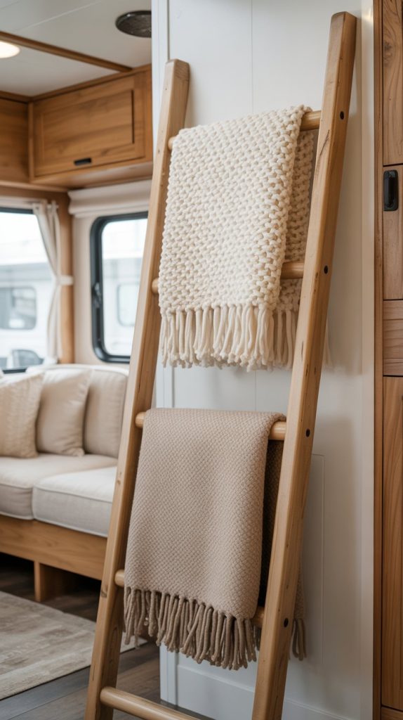 A blanket ladder is both a practical storage solution and a beautiful decorative element. This image features a simple, rustic wooden ladder leaning casually against a living room wall. It gracefully displays two or three folded throw blankets in neutral tones—a chunky knit, a soft fleece, and a woven throw. This keeps cozy blankets accessible and adds a vertical element of texture and warmth.