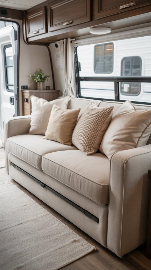 This dual-purpose approach is the heart of smart RV living. Choosing a sofa with a sleek mechanism and comfortable cushions ensures it remains a central, attractive feature of your living room while providing essential sleeping space without compromising the serene aesthetic.