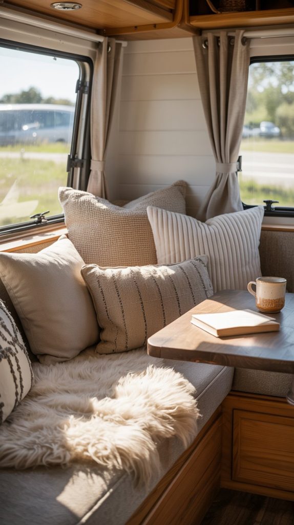 Every serene retreat needs a dedicated spot for relaxation. This image captures a transformed RV dinette, cleverly repurposed into a daytime reading nook. The bench is piled high with an assortment of textured throw pillows in linen and cotton. A soft, faux sheepskin rug is draped over the seat for extra comfort. A small, rustic wooden side table holds a cup of tea and a closed book.