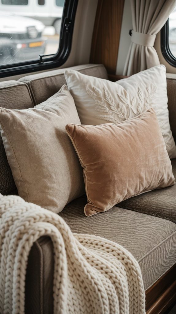 Serenity is achieved through comfort, and this image exemplifies the layered textile approach crucial to a cozy French Country RV. A chunky knit throw blanket in off-white is draped casually over the corner of a plush armchair. A variety of throw pillows in different sizes and textures—linen, velvet, and a subtle embroidered pattern—are piled invitingly on the sofa.