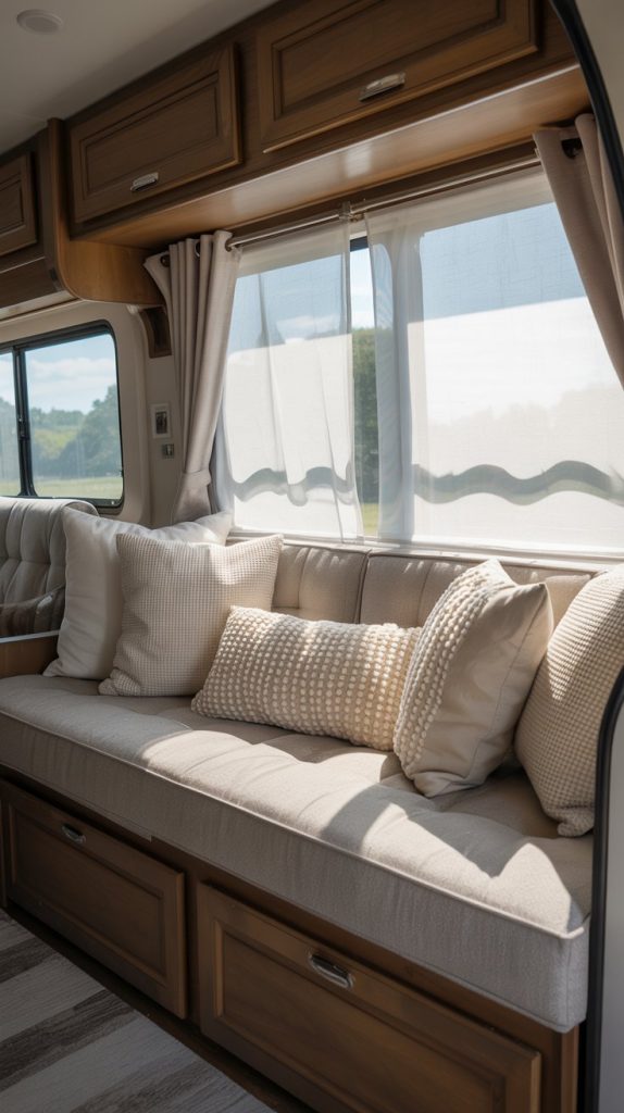Transform a standard RV window into a cherished feature. This image shows a built-in bench seat constructed under a large living room window, upholstered in a soft, durable fabric and piled with plush pillows in linen and cotton. A lift-up lid reveals hidden storage inside for items like spare linens or outdoor gear. It’s the perfect sunny spot to read a book and watch the world go by.