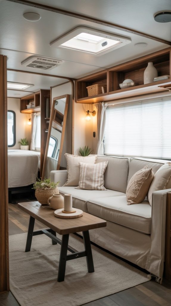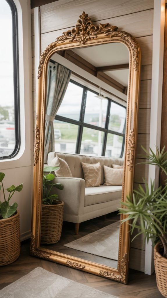 Strategically placed mirrors are a secret weapon for making an RV living room feel larger and brighter. This image features a large, leaning floor mirror with a distressed gold or black iron frame, positioned in a corner to reflect a window and the opposite side of the room. It effectively doubles the natural light and the visual space, making the interior feel open and airy.