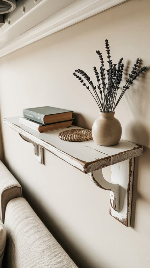 Open shelving is a brilliant way to add character and functionality to an RV living room without sacrificing space. This image showcases a narrow, wall-mounted shelf unit in distressed white wood, positioned above the sofa or beside a window. It’s styled with a carefully curated mix of items: a few hardcover books with neutral covers, a small ceramic vase holding dried lavender, a woven trivet, and a vintage-inspired clock. This display adds personal charm and makes the space feel intentionally decorated.