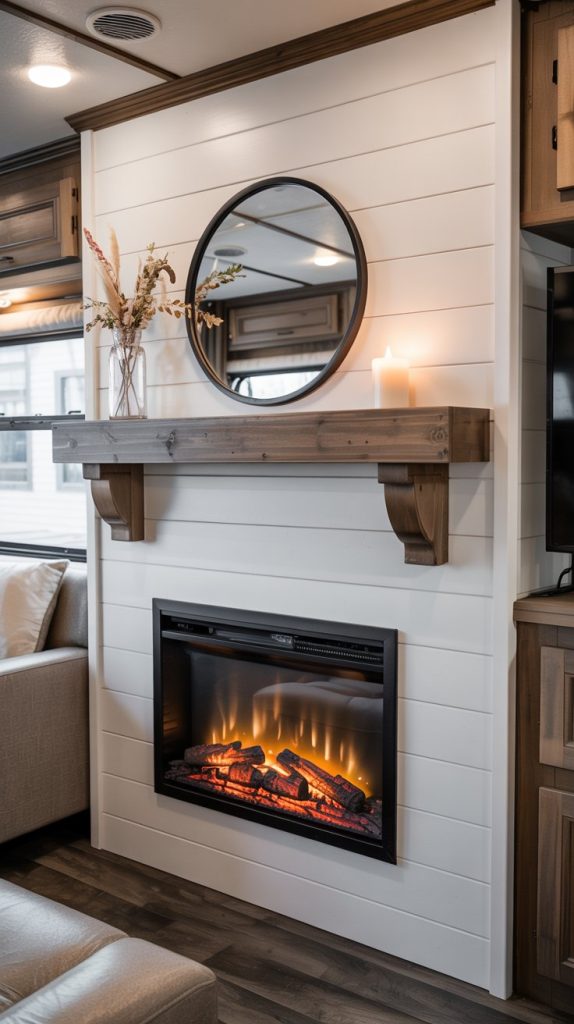 Even an RV living room can enjoy the ambiance of a fireplace. This image showcases an electric fireplace insert installed within a custom shiplap surround. The mantel is made of a distressed wood beam, styled simply with a small mirror, a single candle, and a sprig of eucalyptus. The flames flicker without heat, providing a cozy and romantic focal point.