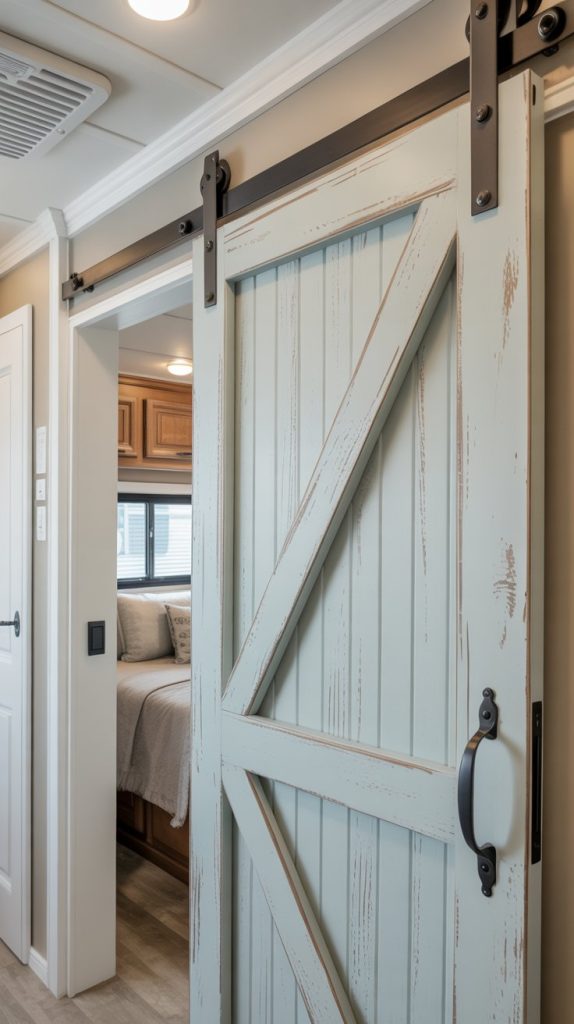 Space-saving solutions in an RV can also be major style statements. This image features a beautiful sliding barn door that separates the bedroom from the living area. Crafted from reclaimed wood with a chalky, pale blue paint finish and a black wrought iron track and hardware, it is both functional and a stunning focal point. The door adds a rustic, architectural element that elevates the entire space.