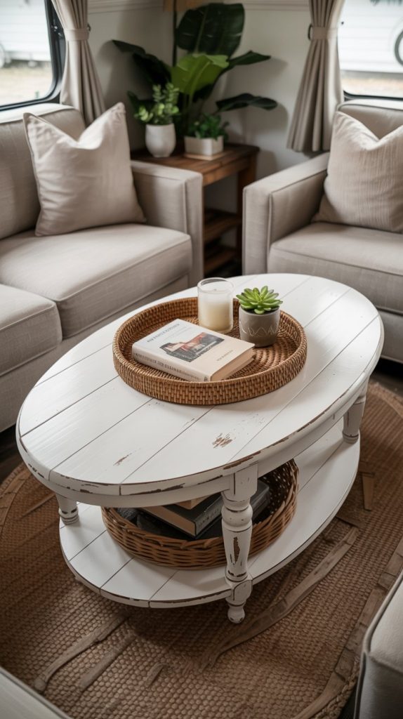 The coffee table is the anchor of any living room. This image centers on a rustic, oval-shaped coffee table with a distressed white or natural wood finish. It replaces a standard, bulky RV table with a piece that feels like furniture. On it, a woven tray corrals a few simple items: a hardcover book, a small potted succulent, and a unlit pillar candle, keeping the surface looking tidy and styled.
