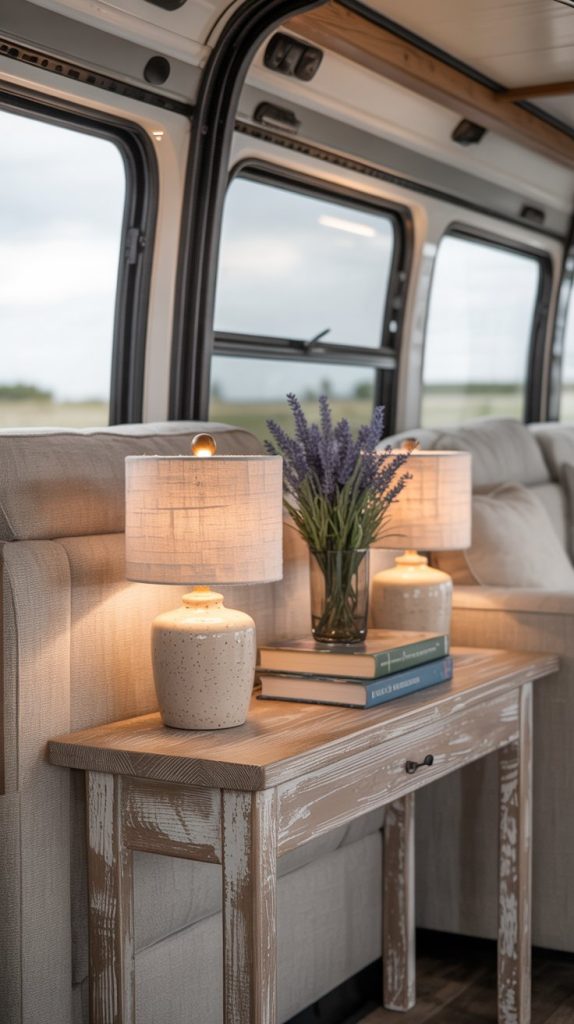 A console table behind the sofa is a quintessential living room feature that can be beautifully adapted for an RV. This image showcases a narrow, rustic console table crafted from reclaimed wood with a whitewashed finish. It sits snugly behind the sofa, styled with a pair of vintage-inspired table lamps, a small stack of books, and a ceramic pitcher holding fresh wildflowers. This instantly adds a layer of depth and residential charm to the living area.