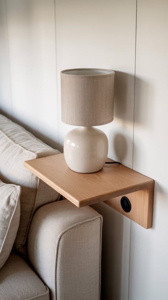Free up precious floor space with floating furniture. This image highlights a small, wooden floating shelf installed right beside the arm of the sofa, acting as a minimalist side table. It holds a simple ceramic lamp with a linen shade and a small coaster for a drink. Its sleek design provides essential functionality without any visual weight or bulky legs.