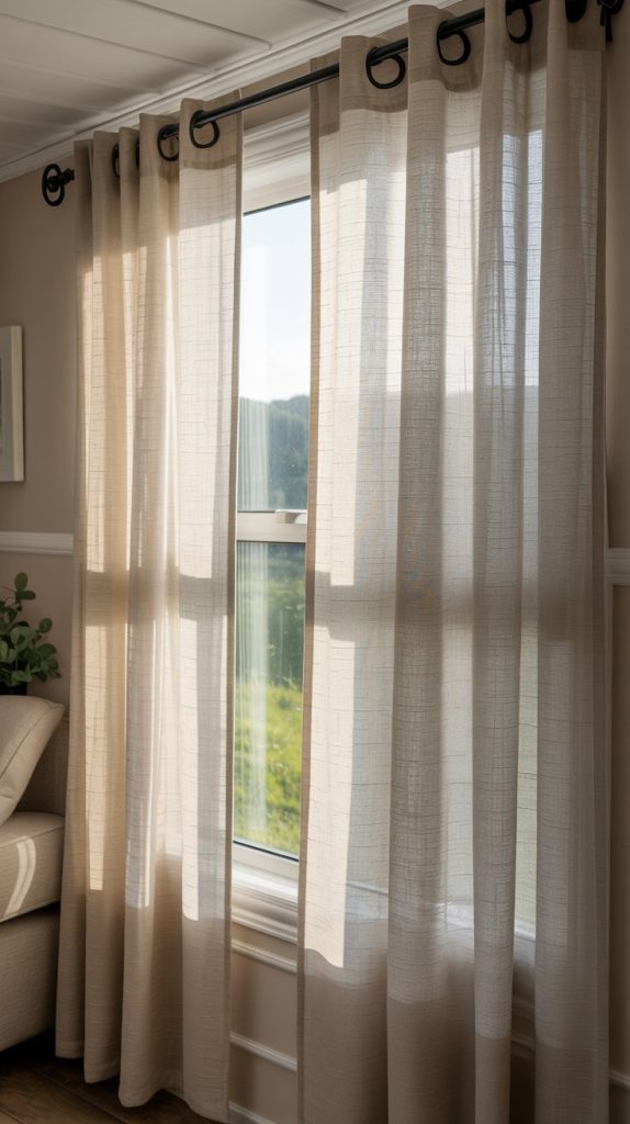 Window treatments are the unsung heroes of ambiance. This image showcases windows dressed in floor-length, sheer linen curtains in an off-white color. They are hung from a simple black wrought iron rod and pooled slightly on the floor for a soft, romantic effect. The sheers filter the harsh sunlight, bathing the interior in a beautiful, soft, diffused glow.
