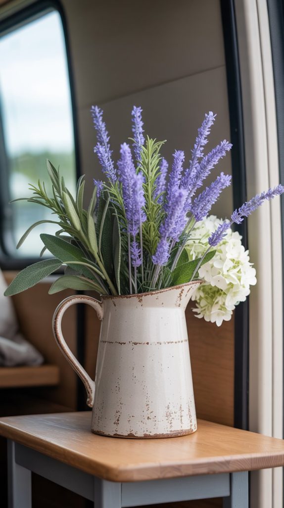 Bringing the garden indoors is a key element of this style. This image captures a simple wooden RV side table holding a petite, ceramic pitcher filled with a loose, fresh bouquet of lavender, sage, and white hydrangeas. The fresh flowers provide a delicate pop of soft purple and green against the neutral backdrop, instantly enlivening the space with color and a subtle, natural fragrance.