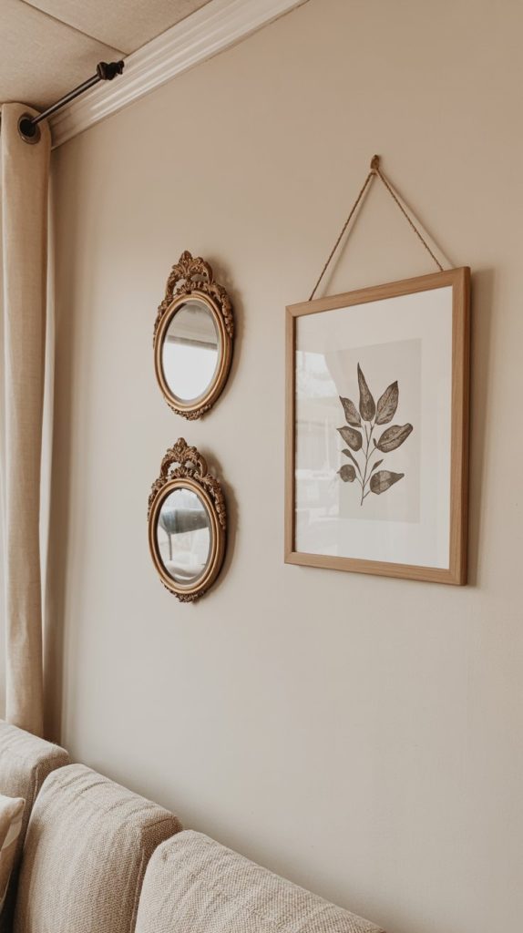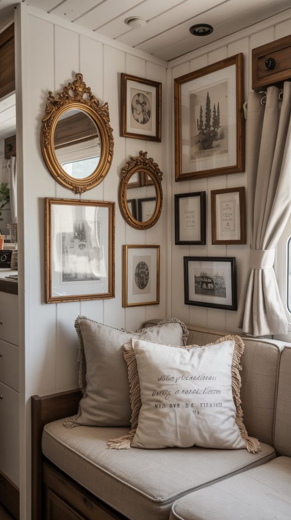 Blank walls are a missed opportunity for personality. This image displays a beautifully curated gallery wall in an RV living area. The arrangement mixes small, ornate gold-framed mirrors with simple black and white botanical prints and vintage French advertising labels. The frames are all within a cohesive color palette (black, white, gold, and natural wood), which keeps the collection from looking messy.