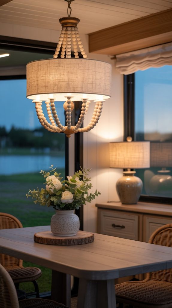 Harsh, modern lighting can shatter the serene atmosphere of a French Country RV. This image showcases the perfect solution: a central light fixture with a distressed white wood bead chandelier. The fixture casts a warm, ambient glow through its simple drum shade, illuminating the dining area below. The rustic wood beads add texture and a handcrafted feel, making the ceiling a focal point.