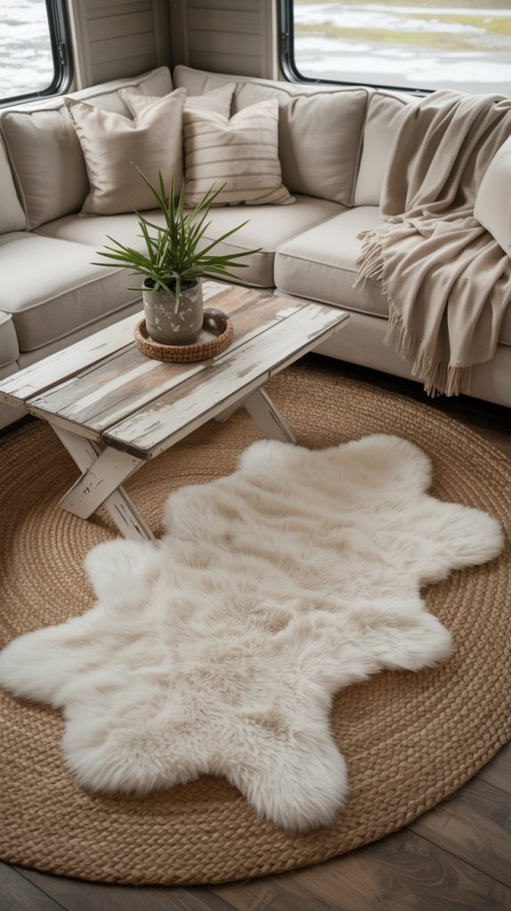 A rug defines a space and adds crucial layers of comfort and texture. This image showcases a large, natural fiber jute or sisal rug layered with a smaller, softer sheepskin or faux hide rug placed just under the coffee table. This combination defines the living area within the open RV floorplan, adds warmth underfoot, and introduces a wonderful mix of textures that is key to the French Country look.
