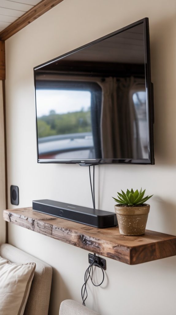Entertainment centers can consume precious floor space in an RV. This image presents a clever and stylish solution: a sleek, flat-screen television mounted directly on a light-colored wall. Below it, a rustic, floating shelf in distressed wood holds a simple soundbar and a few decorative items—a small potted plant and a woven basket for remotes. The wires are neatly concealed for a clean, uncluttered look.
