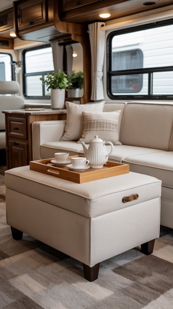 PRO TIP: Use a storage ottoman or a coffee table with a lift-top or built-in storage. This provides a hidden place to stash blankets, remotes, or board games, combining perfect style with essential RV functionality.