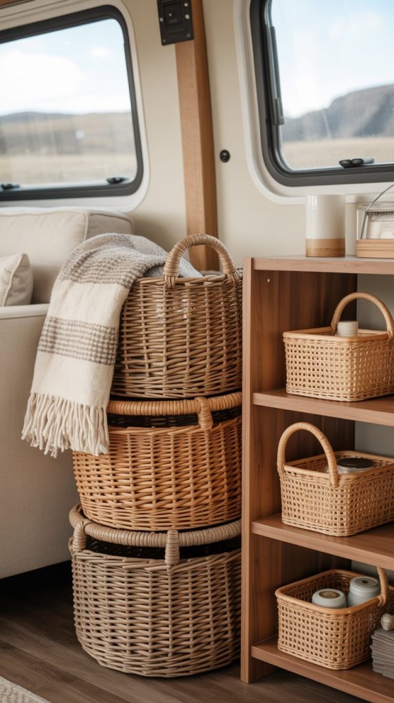 Woven elements are indispensable in achieving the French Country look. This image displays a collection of natural baskets used for clever RV storage. A large, round seagrass basket holds extra throw blankets next to the sofa. Smaller, handled baskets are organized on open shelves, containing remotes, knitting supplies, or napkins. A wide, flat wicker tray on the coffee table corrals a candle and a small vase.