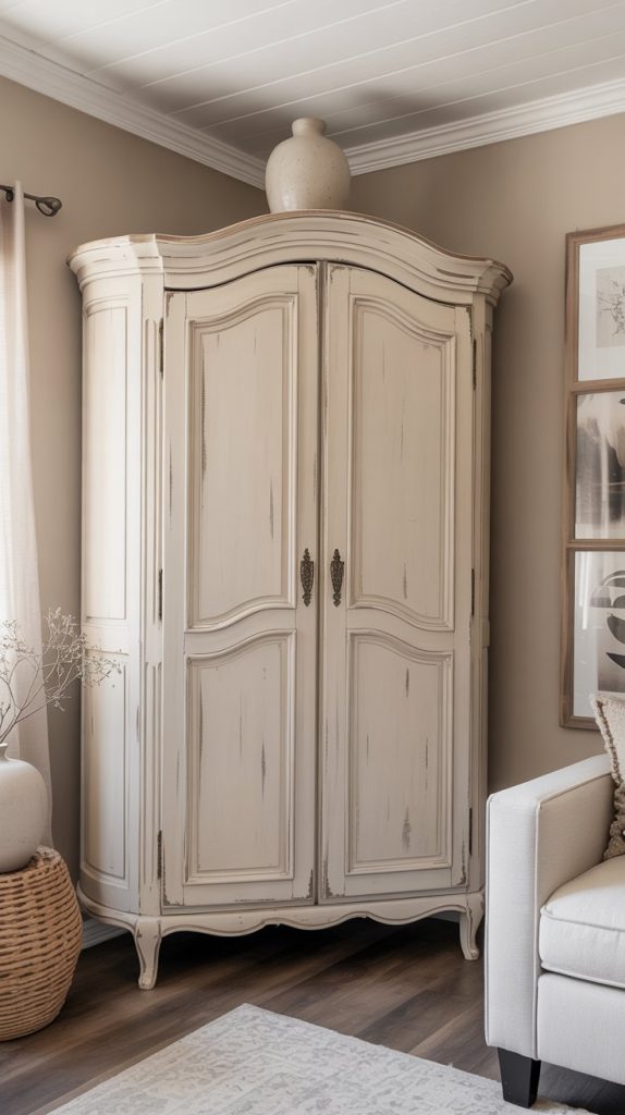 A single statement furniture piece can anchor the entire room. This image highlights a vintage-inspired armoire or wardrobe that has been painted in a soft, distressed cream color. The piece features elegant, curved lines and ornate hardware, providing much-needed closed storage for media equipment, board games, or clothing. Its classic design feels right at home in the RV setting.