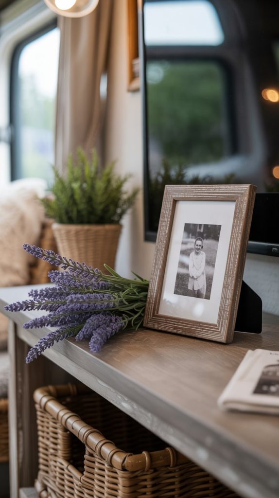 The final element of a serene space is one that is uniquely yours. This image is a close-up of a detail that personalizes the RV living room: a small, framed black-and-white family photo in a simple wood frame on the console table, a vintage book collection that reflects your hobbies, or a beautiful seashell from a favorite trip displayed on a shelf.
