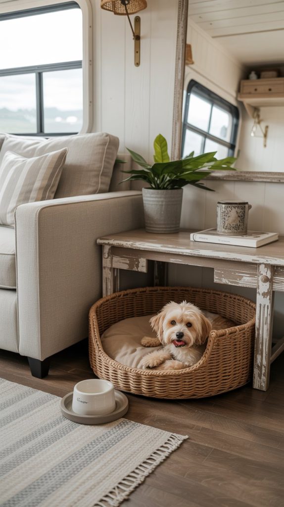For many, an RV isn’t a home without a pet. This image showcases a cleverly integrated nook for a pet bed that blends seamlessly with the living room decor. A woven basket or a small, upholstered pet bed in a neutral color is tucked neatly under the console table or in a corner beside the sofa. A matching water bowl sits on a tray nearby.