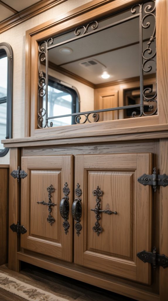 PRO TIP: Look for vintage-inspired drawer pulls, cabinet handles, and curtain rods in a black wrought iron finish. Swapping out standard RV hardware for these is an easy, affordable DIY upgrade that makes a massive impact on your interior’s aesthetic.