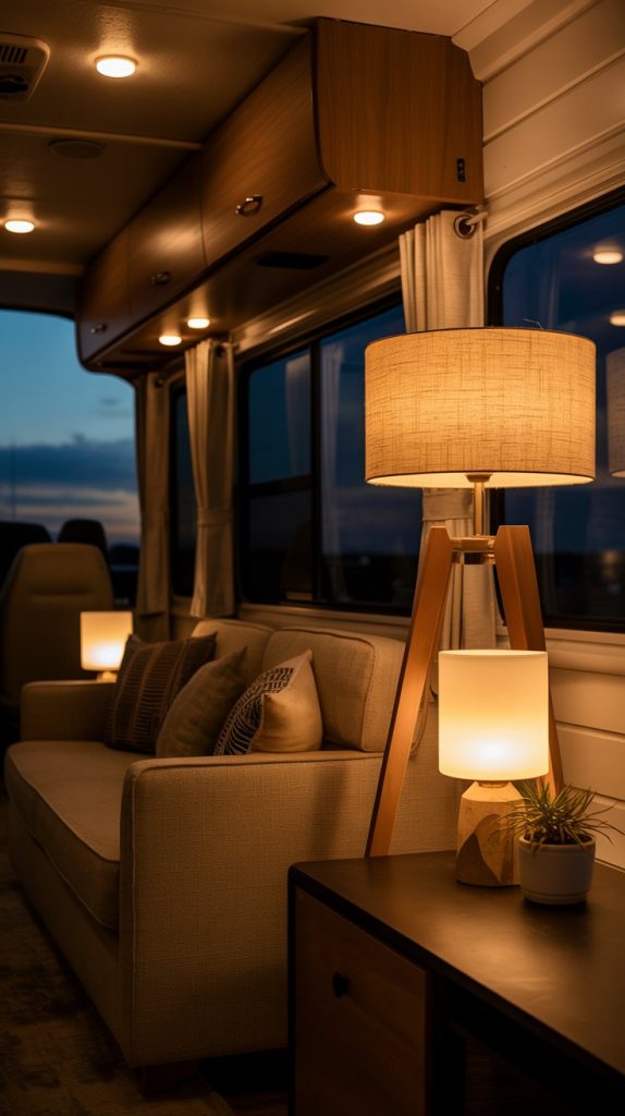 This combination allows you to adjust the lighting for any activity, from bright reading light to a soft, intimate glow for relaxing. Avoiding the main RV lights creates a cozy, inviting atmosphere that feels much more like a cottage than a vehicle.
