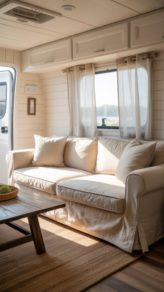 Maximizing functionality is key in an RV, and the main sofa is often the largest piece of furniture. This image showcases a beautiful, stylish sofa upholstered in a soft, durable beige linen-like fabric. By day, it’s piled with an assortment of textural throw pillows in cream and white, serving as the perfect spot for lounging. By night, it easily converts into a comfortable bed for guests, proving that practicality doesn’t have to sacrifice style.