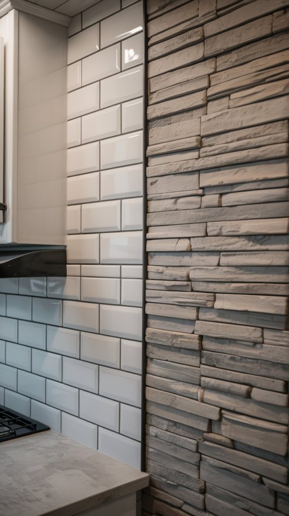 Introducing different textures is key to a layered design. This image focuses on the RV’s backsplash or a single accent wall, featuring beveled white subway tile with dark grout or thin, stacked stone veneer. This adds a touch of rustic, Old World texture and character, reminiscent of a French farmhouse.