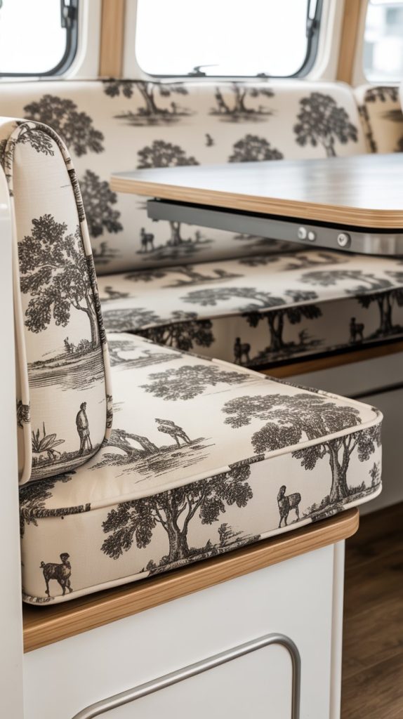 No French Country theme is complete without the iconic Toile de Jouy fabric. This image features an RV dinette where the bench cushions are upholstered in a classic black and white toile pattern depicting pastoral scenes. This immediately anchors the space with a traditional European elegance. To balance the potentially busy pattern, the surrounding elements are kept simple: a solid white table, light wood floors, and unadorned windows.